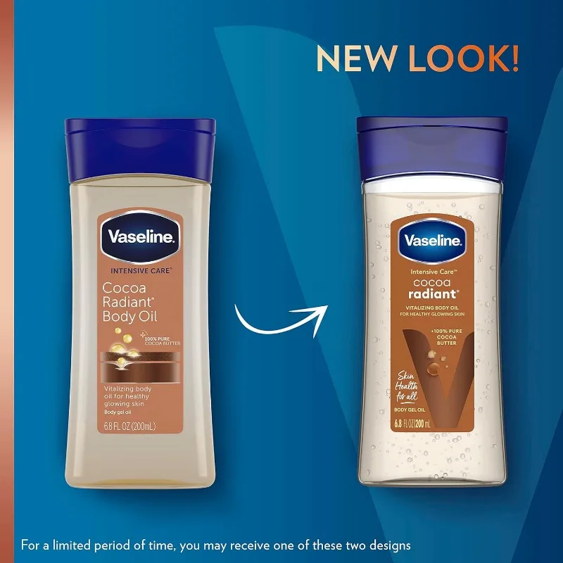 Vaseline Intensive Care Cocoa Radiant Body Gel Oil – This luxurious gel oil infused with 100% pure cocoa butter gives your skin the ultimate glow. Designed to deeply hydrate and replenish dry skin, this fast-absorbing formula locks in moisture, leaving your skin feeling silky smooth, radiant, and nourished. The lightweight, non-greasy texture glides effortlessly, providing an instant luminous glow without a heavy residue.